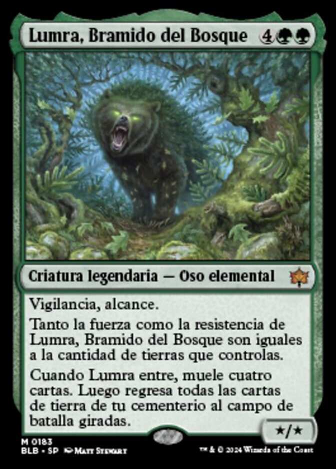| Rules | Vigilance, reach Lumra, Bellow of the Woods's power and toughness are each equal to the number of lands you control. When Lumra enters, mill four cards. Then return all land cards from your graveyard to the battlefield tapped. |
