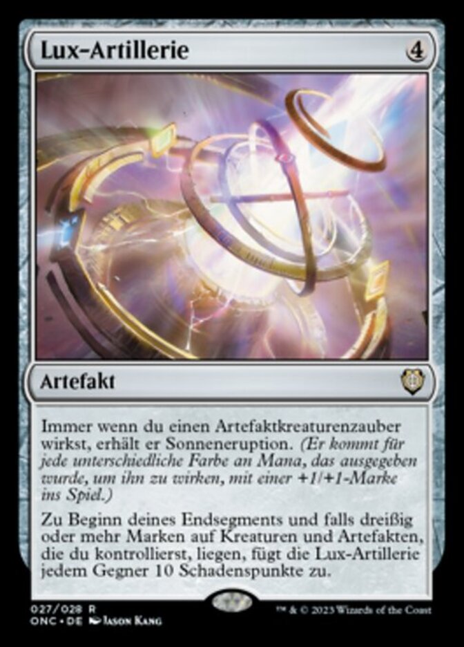 | Rules | Whenever you cast an artifact creature spell, it gains sunburst. (It enters the battlefield with a +1/+1 counter on it for each color of mana spent to cast it.) At the beginning of your end step, if there are thirty or more counters among artifacts and creatures you control, Lux Artillery deals 10 damage to each opponent. |