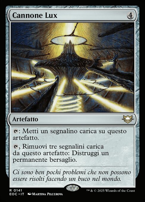 | Rules | : Put a charge counter on Lux Cannon. , Remove three charge counters from Lux Cannon: Destroy target permanent. |