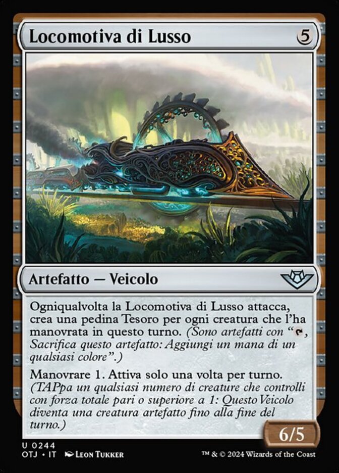 | Rules | Whenever Luxurious Locomotive attacks, create a Treasure token for each creature that crewed it this turn. (They're artifacts with ", Sacrifice this artifact: Add one mana of any color.") Crew 1. Activate only once each turn. (Tap any number of creatures you control with total power 1 or more: This Vehicle becomes an artifact creature until end of turn.) |