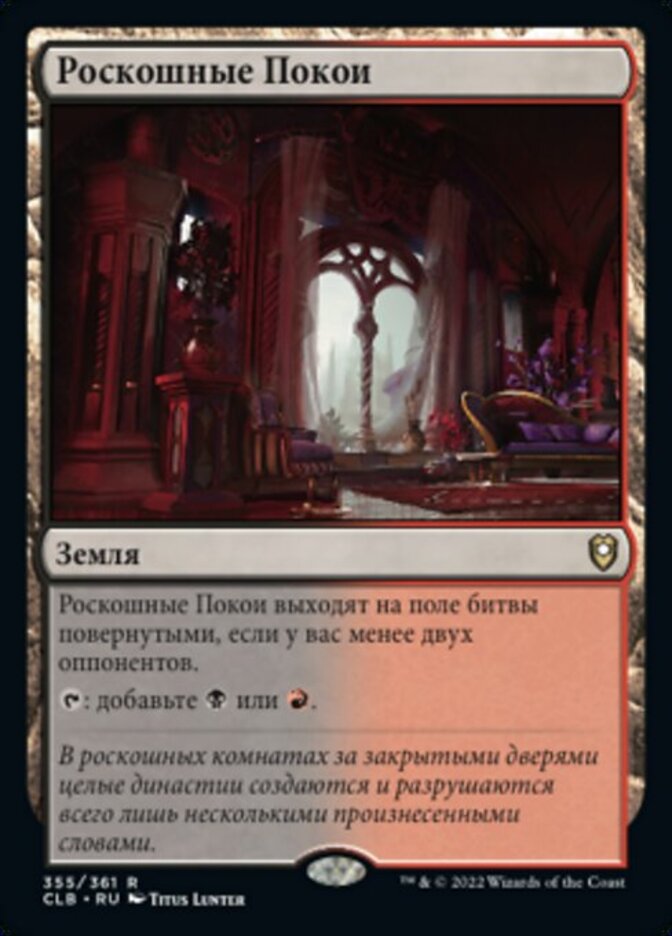 | Rules | Luxury Suite enters the battlefield tapped unless you have two or more opponents. : Add or . |