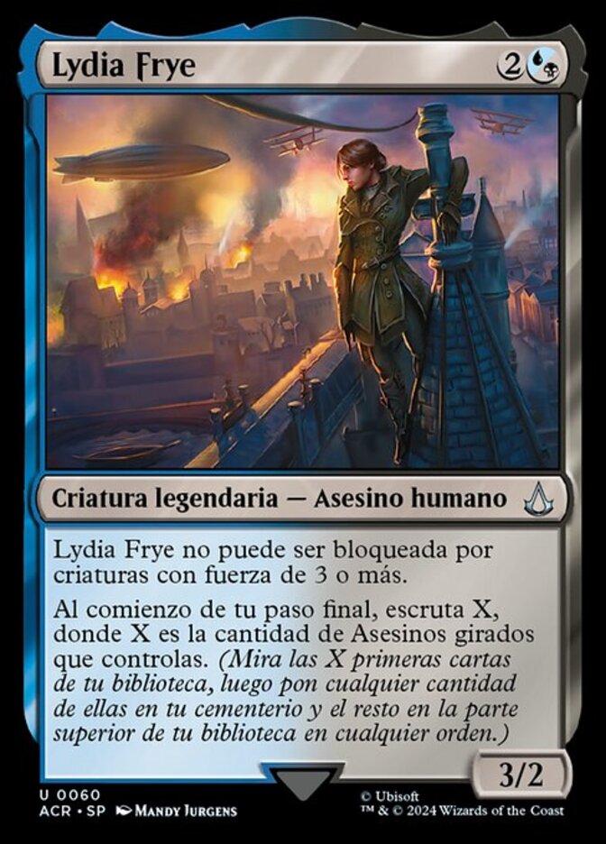 | Rules | Lydia Frye can't be blocked by creatures with power 3 or greater. At the beginning of your end step, surveil X, where X is the number of tapped Assassins you control. (Look at the top X cards of your library, then put any number of them into your graveyard and the rest on top of your library in any order.) |