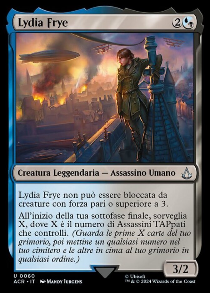 | Rules | Lydia Frye can't be blocked by creatures with power 3 or greater. At the beginning of your end step, surveil X, where X is the number of tapped Assassins you control. (Look at the top X cards of your library, then put any number of them into your graveyard and the rest on top of your library in any order.) |