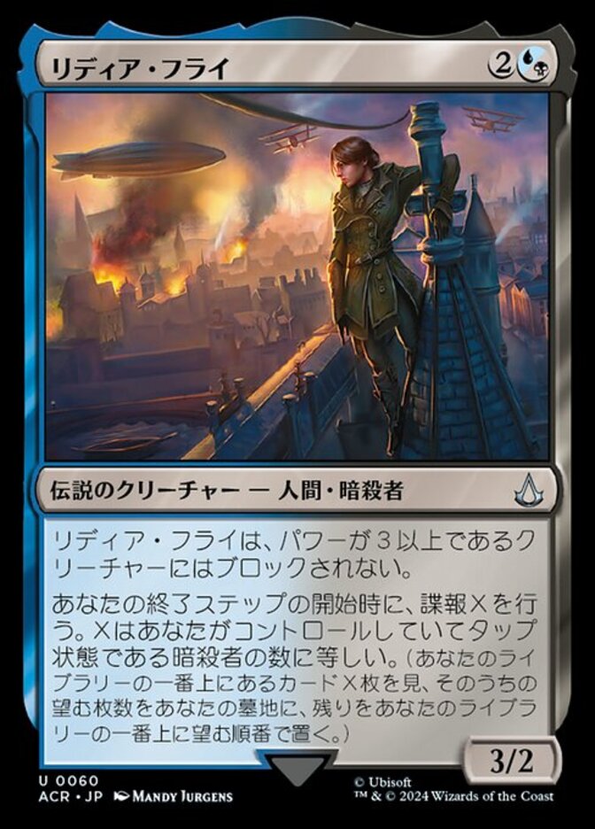 | Rules | Lydia Frye can't be blocked by creatures with power 3 or greater. At the beginning of your end step, surveil X, where X is the number of tapped Assassins you control. (Look at the top X cards of your library, then put any number of them into your graveyard and the rest on top of your library in any order.) |