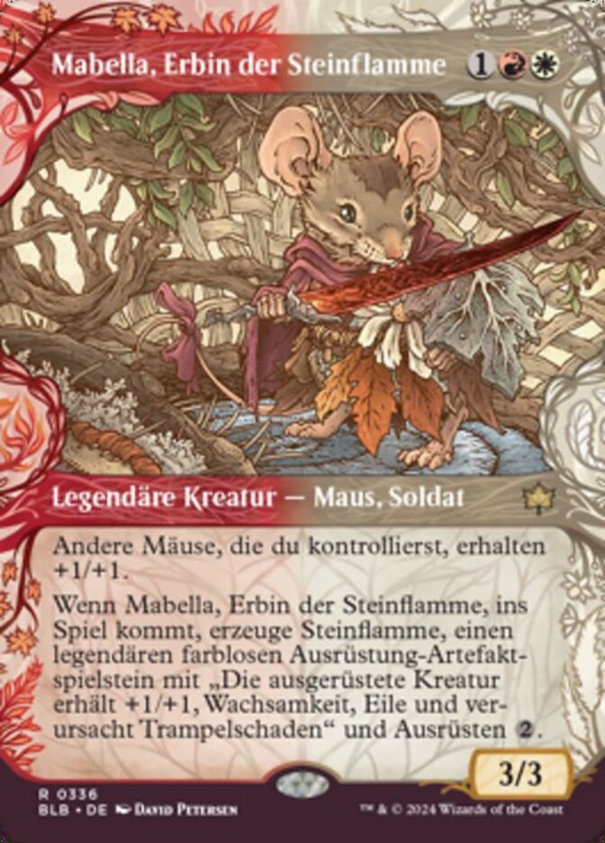 | Rules | Other Mice you control get +1/+1. When Mabel, Heir to Cragflame enters, create Cragflame, a legendary colorless Equipment artifact token with "Equipped creature gets +1/+1 and has vigilance, trample, and haste" and equip . |