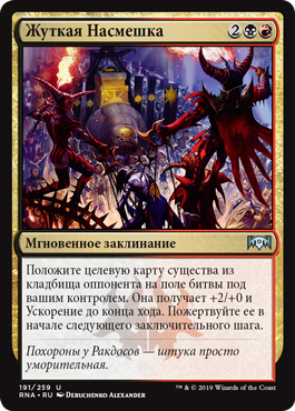 | Rules | Put target creature card from an opponent's graveyard onto the battlefield under your control. It gets +2/+0 and gains haste until end of turn. Sacrifice it at the beginning of the next end step. |