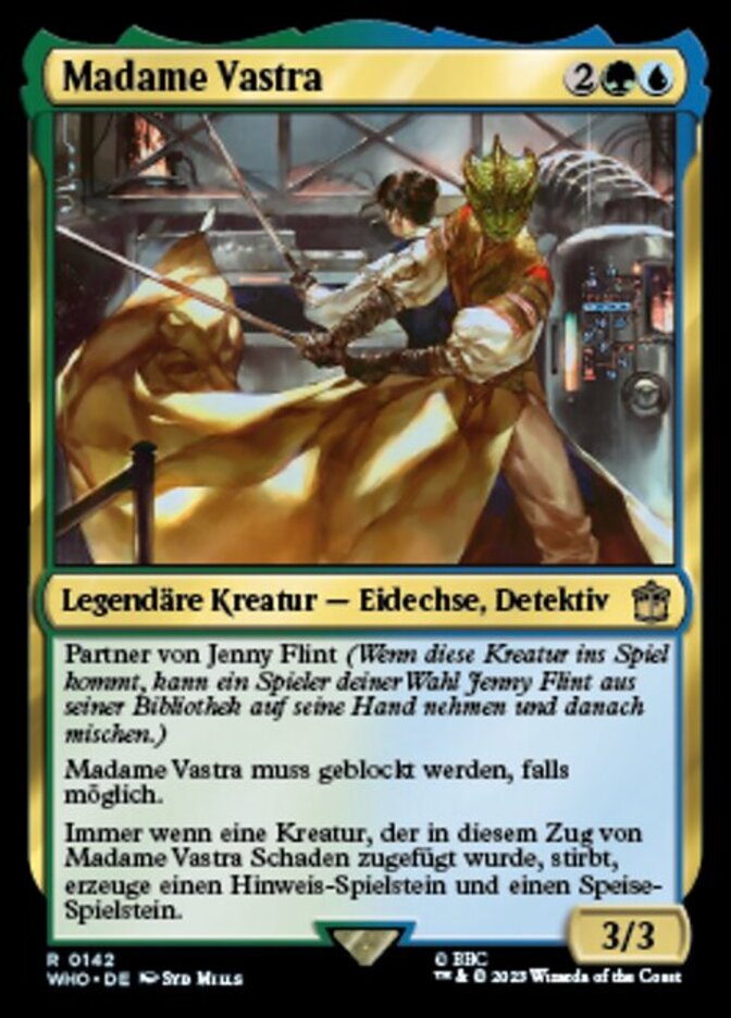 | Rules | Partner with Jenny Flint (When this creature enters the battlefield, target player may put Jenny Flint into their hand from their library, then shuffle.) Madame Vastra must be blocked if able. Whenever a creature dealt damage by Madame Vastra this turn dies, create a Clue token and a Food token. |