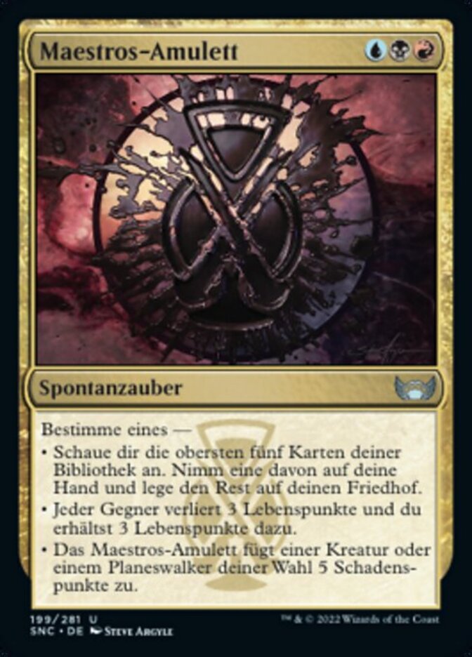 | Rules | Choose one — • Look at the top five cards of your library. Put one of those cards into your hand and the rest into your graveyard. • Each opponent loses 3 life and you gain 3 life. • Maestros Charm deals 5 damage to target creature or planeswalker. |