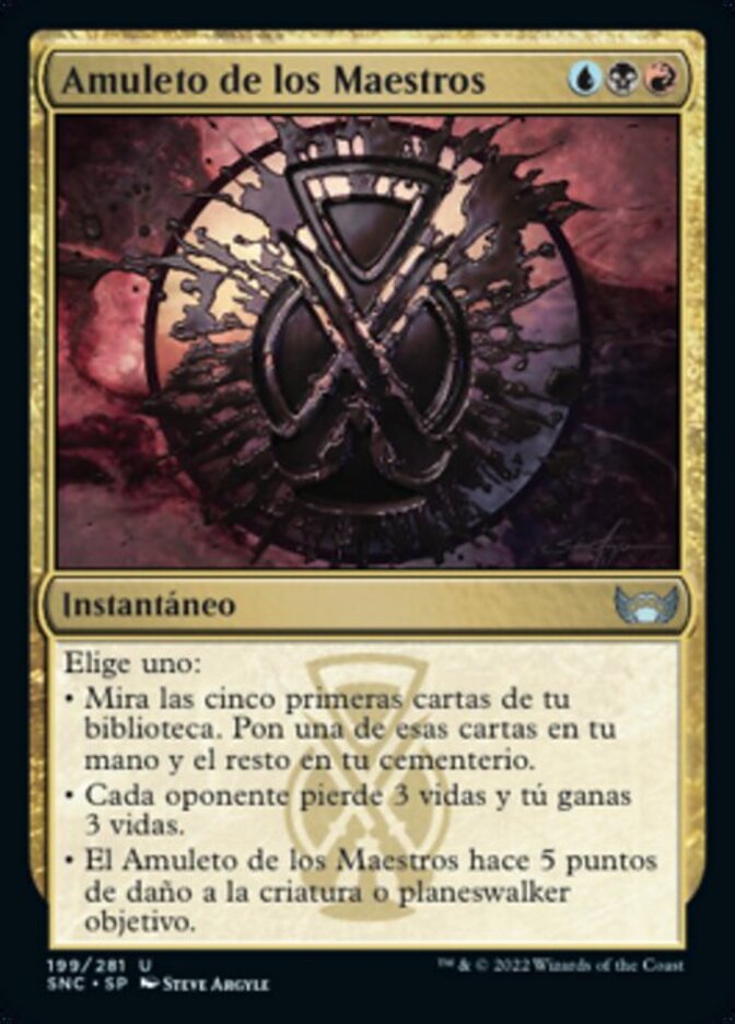 | Rules | Choose one — • Look at the top five cards of your library. Put one of those cards into your hand and the rest into your graveyard. • Each opponent loses 3 life and you gain 3 life. • Maestros Charm deals 5 damage to target creature or planeswalker. |