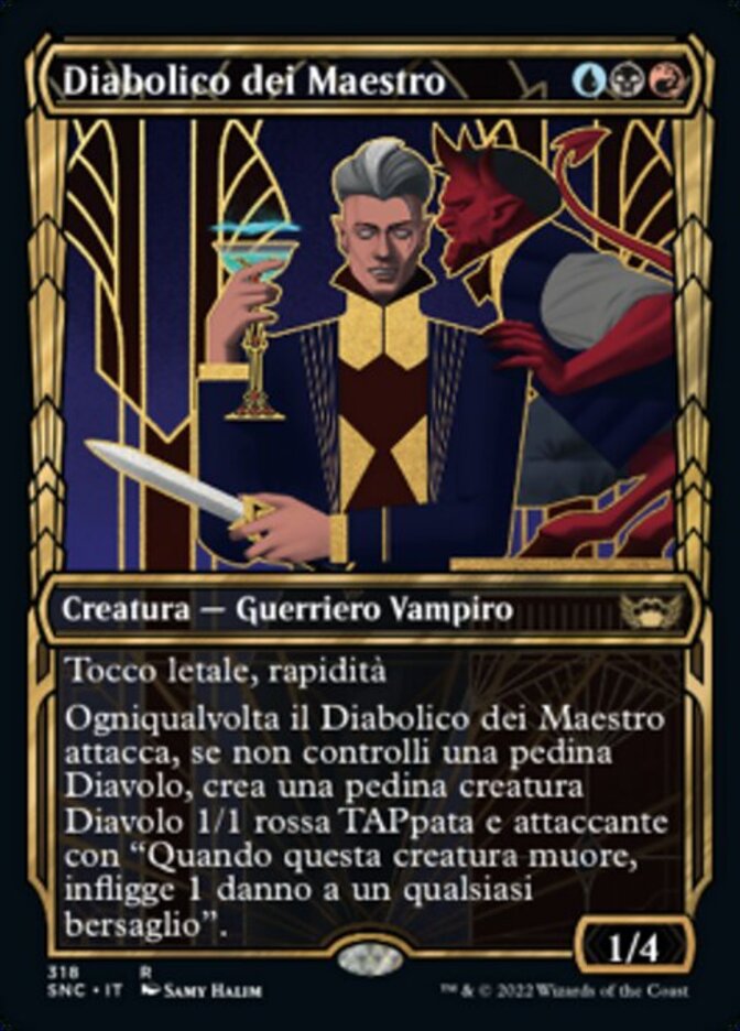 | Rules | Deathtouch, haste Whenever Maestros Diabolist attacks, if you don't control a Devil token, create a tapped and attacking 1/1 red Devil creature token with "When this creature dies, it deals 1 damage to any target." |