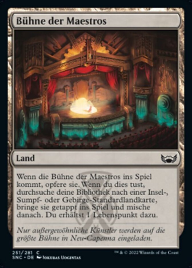 | Rules | When Maestros Theater enters the battlefield, sacrifice it. When you do, search your library for a basic Island, Swamp, or Mountain card, put it onto the battlefield tapped, then shuffle and you gain 1 life. |