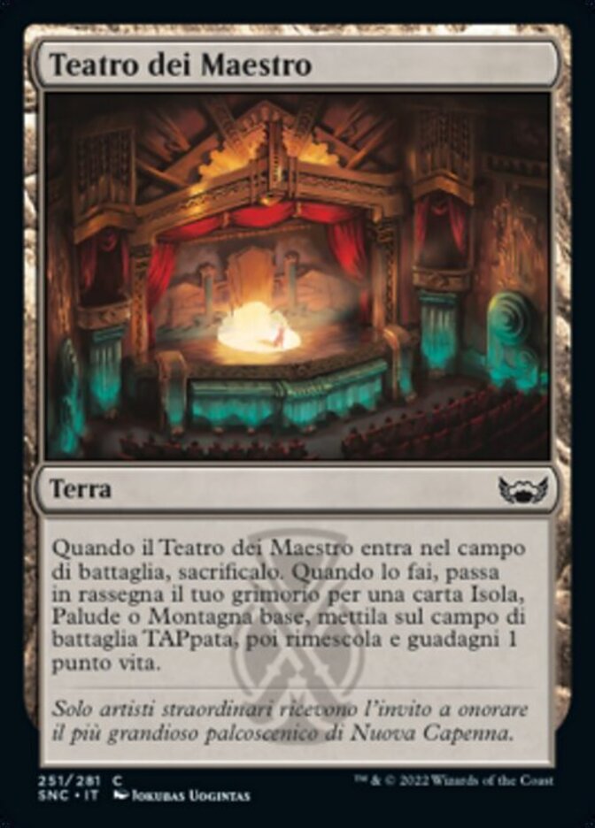 | Rules | When Maestros Theater enters the battlefield, sacrifice it. When you do, search your library for a basic Island, Swamp, or Mountain card, put it onto the battlefield tapped, then shuffle and you gain 1 life. |
