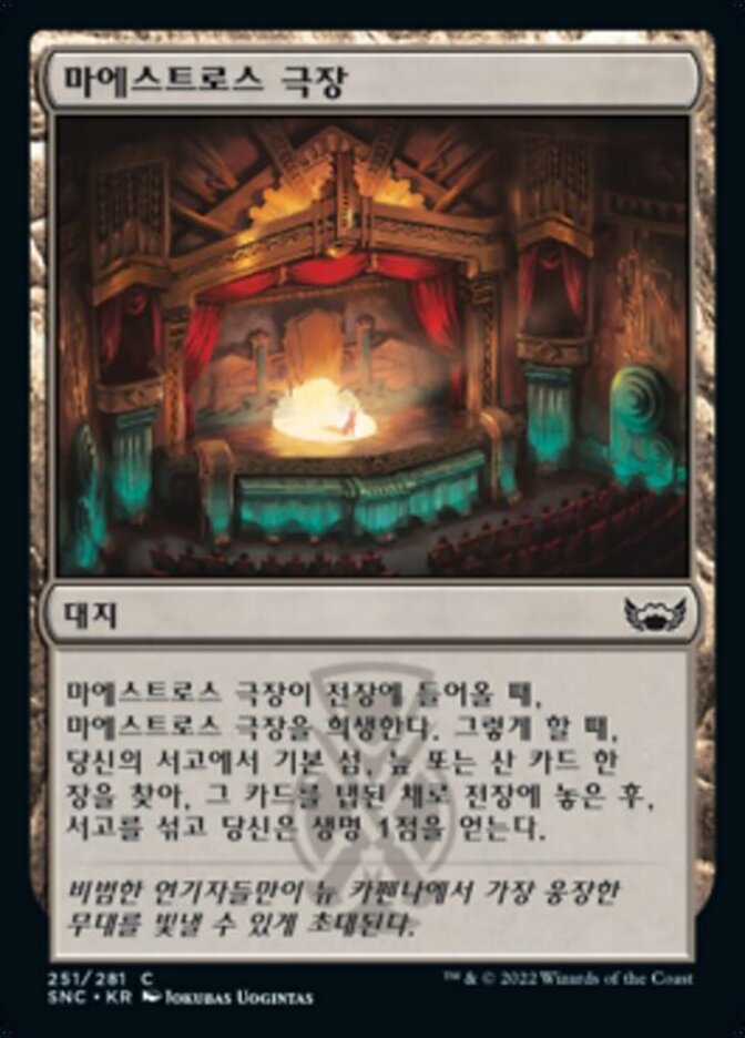 Rules When Maestros Theater enters the battlefield, sacrifice it. When you do, search your library for a basic Island, Swamp, or Mountain card, put it onto the battlefield tapped, then shuffle and you gain 1 life.