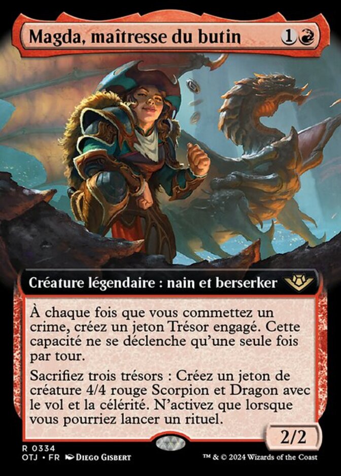 | Rules | Whenever you commit a crime, create a tapped Treasure token. This ability triggers only once each turn. (Targeting opponents, anything they control, and/or cards in their graveyards is a crime.) Sacrifice three Treasures: Create a 4/4 red Scorpion Dragon creature token with flying and haste. Activate only as a sorcery. |