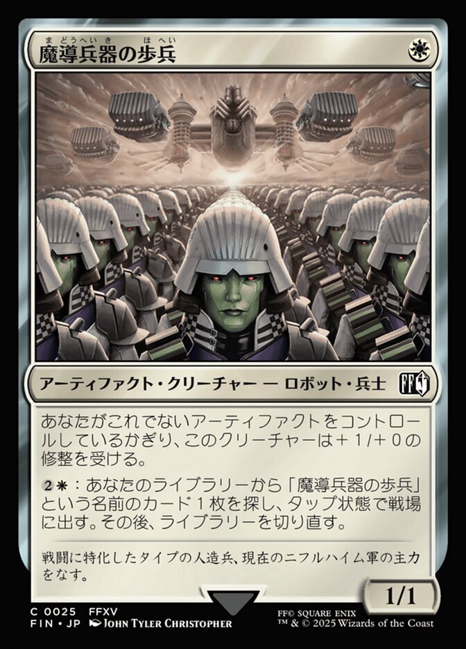 | Rules | This creature gets +1/+0 as long as you control another artifact. : Search your library for a card named Magitek Infantry, put it onto the battlefield tapped, then shuffle. |
