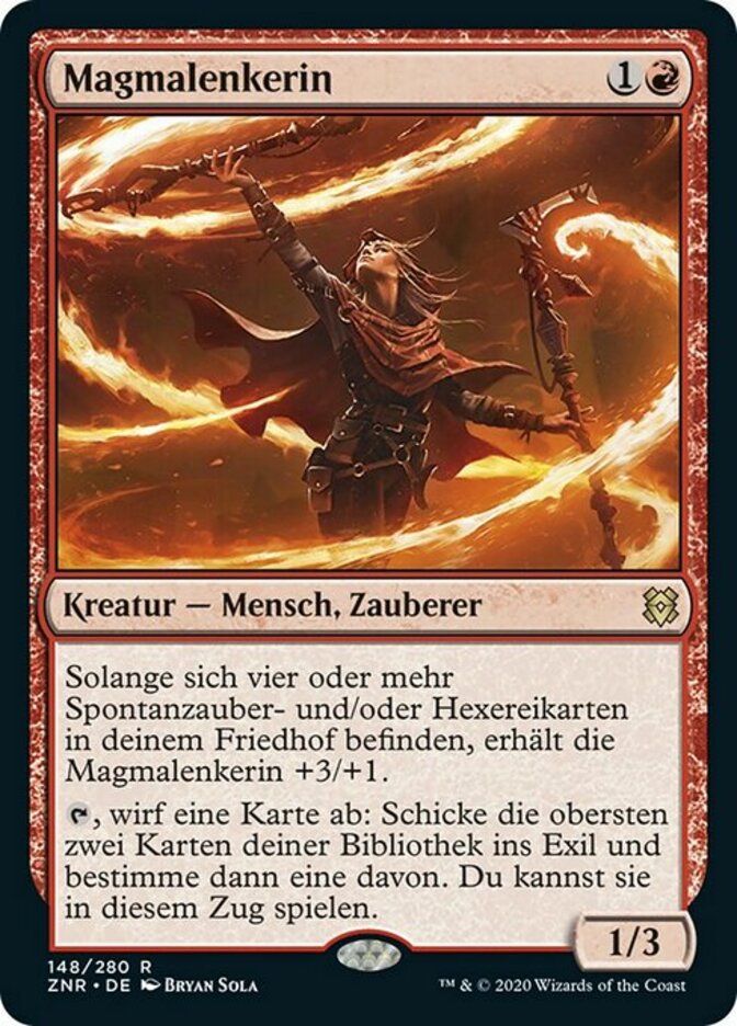 | Rules | As long as there are four or more instant and/or sorcery cards in your graveyard, Magmatic Channeler gets +3/+1. , Discard a card: Exile the top two cards of your library, then choose one of them. You may play that card this turn. |