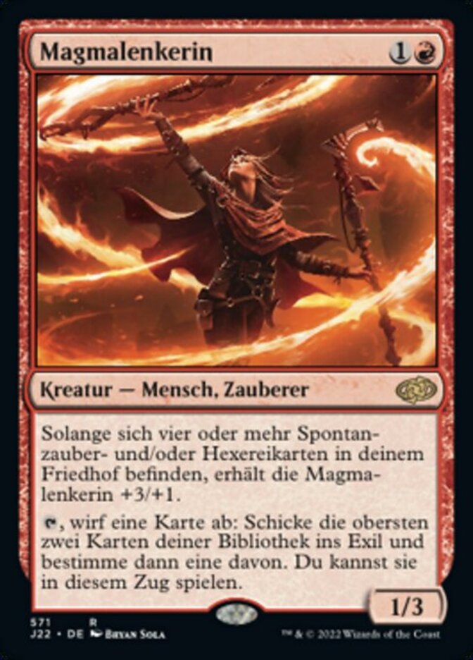 | Rules | As long as there are four or more instant and/or sorcery cards in your graveyard, Magmatic Channeler gets +3/+1. , Discard a card: Exile the top two cards of your library, then choose one of them. You may play that card this turn. |