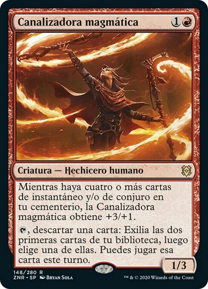| Rules | As long as there are four or more instant and/or sorcery cards in your graveyard, Magmatic Channeler gets +3/+1. , Discard a card: Exile the top two cards of your library, then choose one of them. You may play that card this turn. |