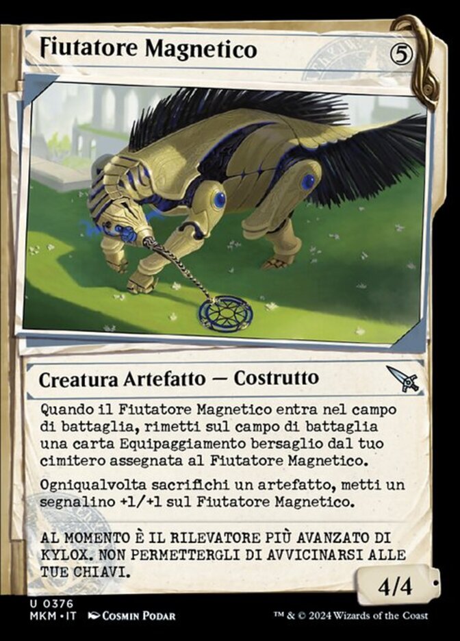 | Rules | When Magnetic Snuffler enters the battlefield, return target Equipment card from your graveyard to the battlefield attached to Magnetic Snuffler. Whenever you sacrifice an artifact, put a +1/+1 counter on Magnetic Snuffler. |