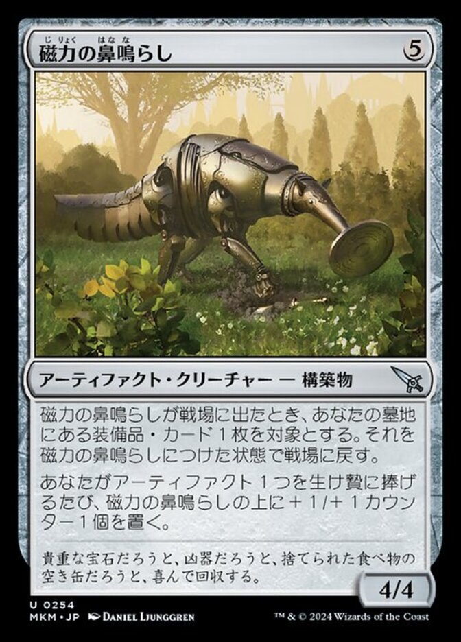 | Rules | When Magnetic Snuffler enters the battlefield, return target Equipment card from your graveyard to the battlefield attached to Magnetic Snuffler. Whenever you sacrifice an artifact, put a +1/+1 counter on Magnetic Snuffler. |