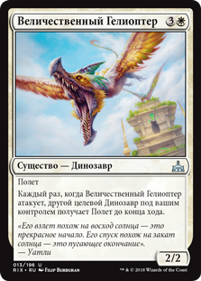 | Rules | Flying Whenever Majestic Heliopterus attacks, another target Dinosaur you control gains flying until end of turn. |