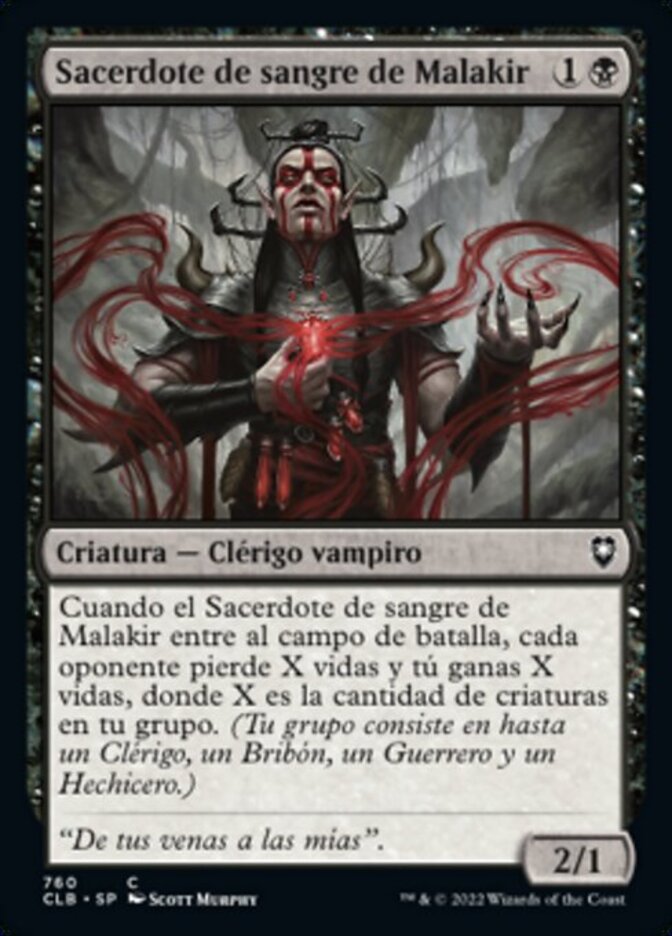| Rules | When Malakir Blood-Priest enters the battlefield, each opponent loses X life and you gain X life, where X is the number of creatures in your party. (Your party consists of up to one each of Cleric, Rogue, Warrior, and Wizard.) |