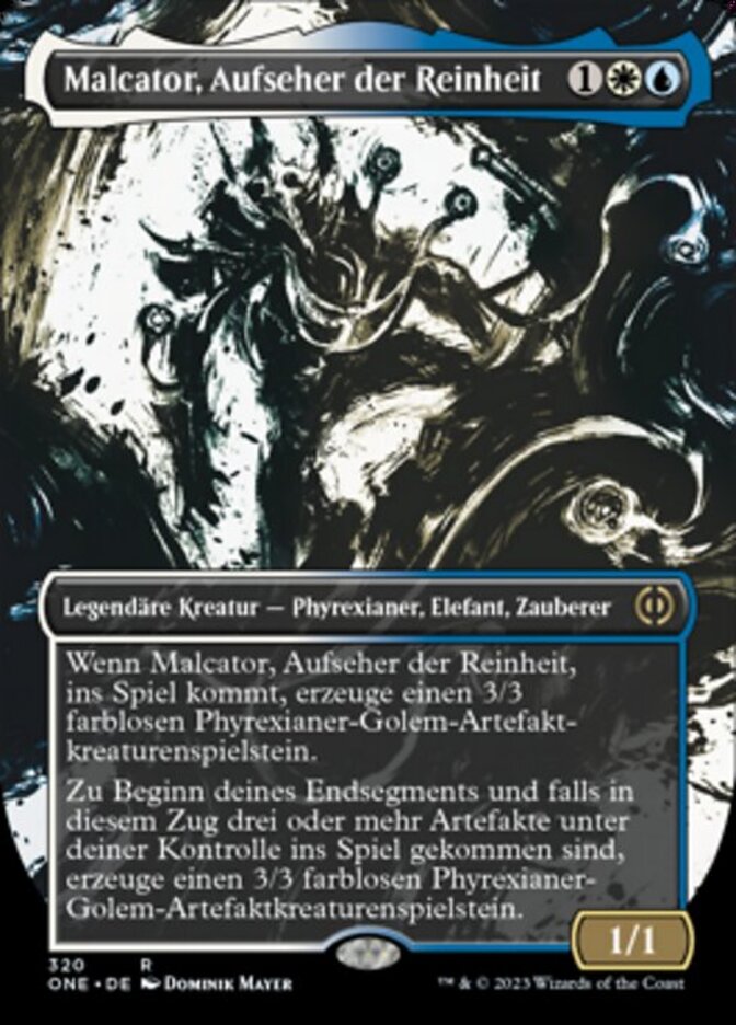 | Rules | When Malcator, Purity Overseer enters the battlefield, create a 3/3 colorless Phyrexian Golem artifact creature token. At the beginning of your end step, if three or more artifacts entered the battlefield under your control this turn, create a 3/3 colorless Phyrexian Golem artifact creature token. |
