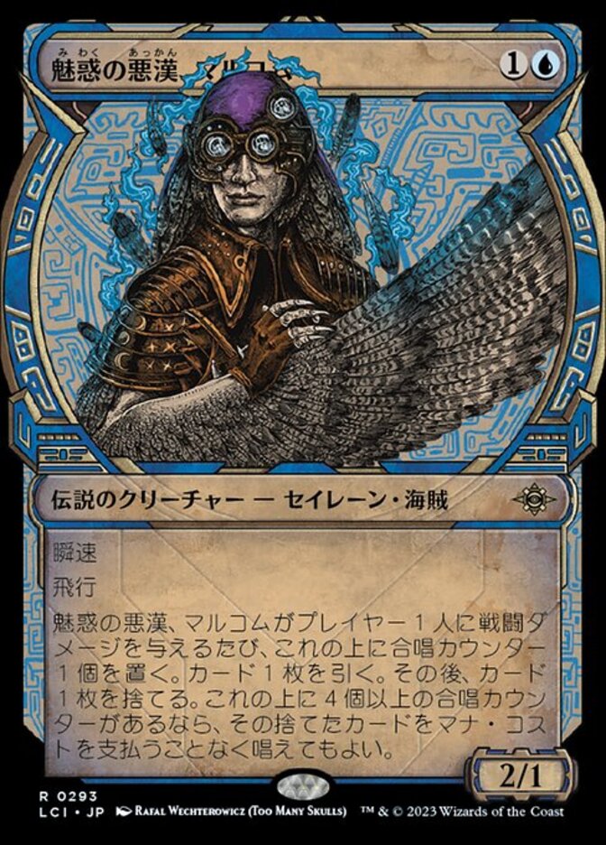 | Rules | Flash Flying Whenever Malcolm, Alluring Scoundrel deals combat damage to a player, put a chorus counter on it. Draw a card, then discard a card. If there are four or more chorus counters on Malcolm, you may cast the discarded card without paying its mana cost. |