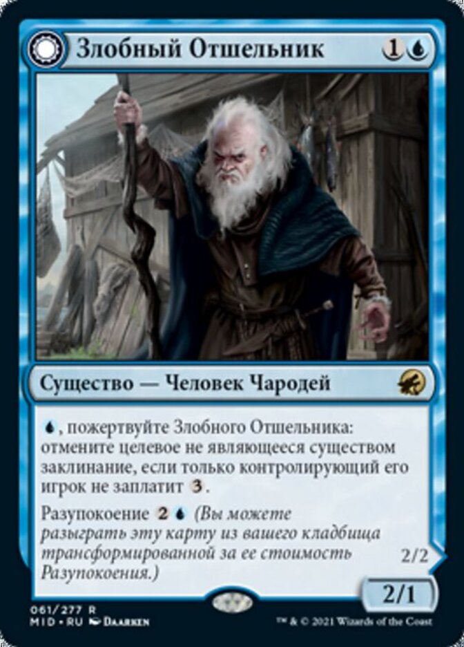 | Rules | , Sacrifice Malevolent Hermit: Counter target noncreature spell unless its controller pays . Disturb (You may cast this card from your graveyard transformed for its disturb cost.) // Flying Noncreature spells you control can't be countered. If Benevolent Geist would be put into a graveyard from anywhere, exile it instead. |