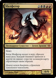 | Rules | Flying When Malfegor enters the battlefield, discard your hand. Each opponent sacrifices a creature for each card discarded this way. |