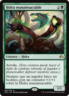 | Rules | Trample Whenever a player casts a spell, put a +1/+1 counter on Managorger Hydra. |