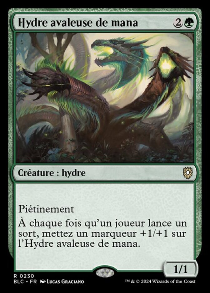| Rules | Trample Whenever a player casts a spell, put a +1/+1 counter on Managorger Hydra. |