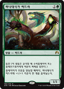 | Rules | Trample Whenever a player casts a spell, put a +1/+1 counter on Managorger Hydra. |