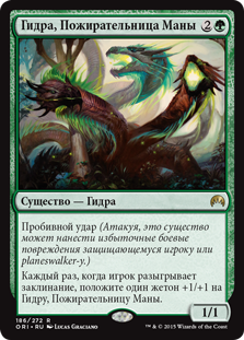 | Rules | Trample Whenever a player casts a spell, put a +1/+1 counter on Managorger Hydra. |