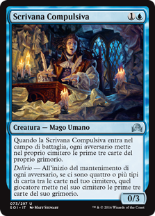 | Rules | When Manic Scribe enters the battlefield, each opponent mills three cards. Delirium — At the beginning of each opponent's upkeep, if there are four or more card types among cards in your graveyard, that player mills three cards. |