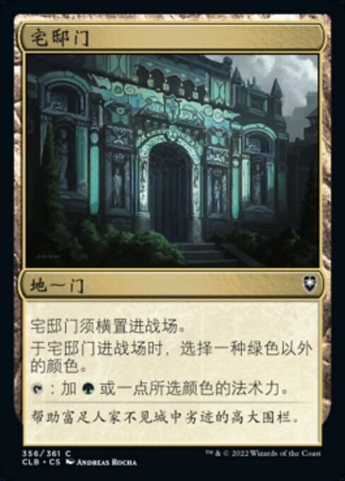 | Rules | Manor Gate enters the battlefield tapped. As Manor Gate enters the battlefield, choose a color other than green. : Add or one mana of the chosen color. |