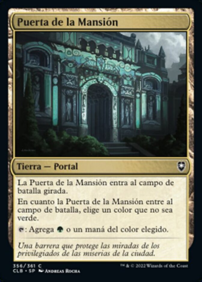 | Rules | Manor Gate enters the battlefield tapped. As Manor Gate enters the battlefield, choose a color other than green. : Add or one mana of the chosen color. |