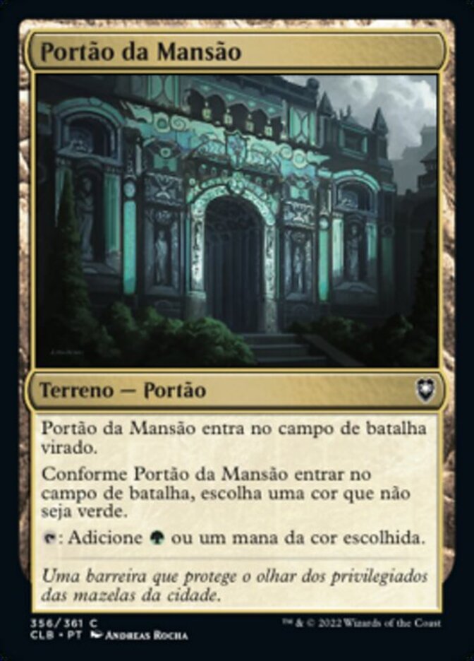 | Rules | Manor Gate enters the battlefield tapped. As Manor Gate enters the battlefield, choose a color other than green. : Add or one mana of the chosen color. |