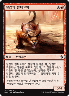 | Rules | When Manticore of the Gauntlet enters the battlefield, put a -1/-1 counter on target creature you control. Manticore of the Gauntlet deals 3 damage to target opponent or planeswalker. |
