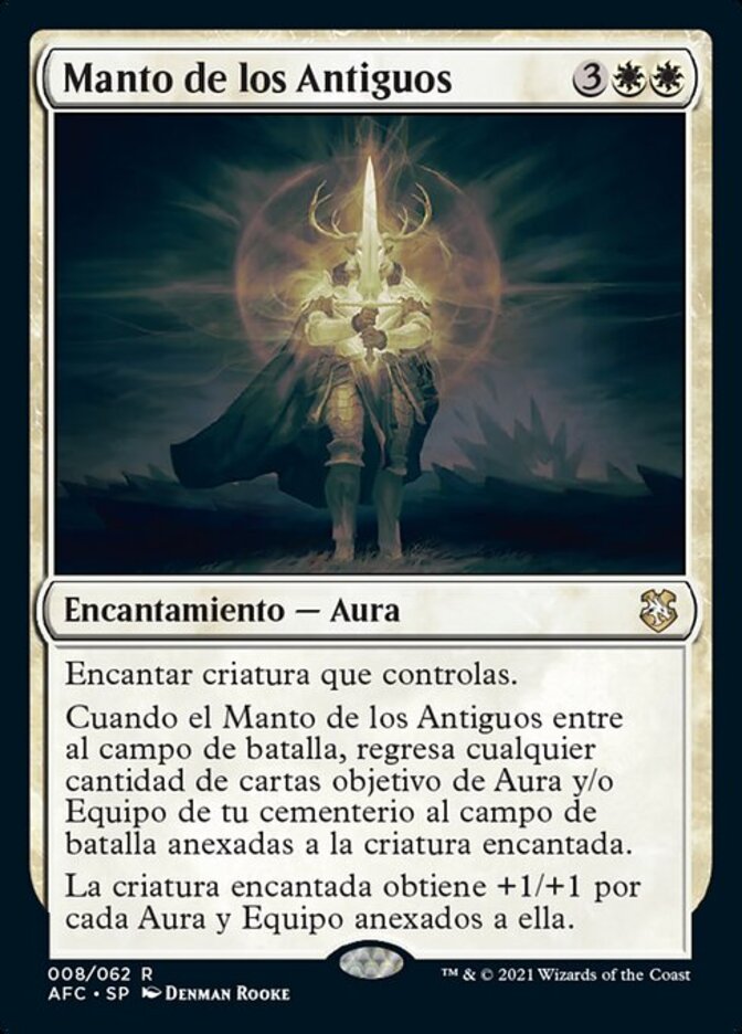 | Rules | Enchant creature you control When Mantle of the Ancients enters the battlefield, return any number of target Aura and/or Equipment cards that could be attached to enchanted creature from your graveyard to the battlefield attached to enchanted creature. Enchanted creature gets +1/+1 for each Aura and Equipment attached to it. |