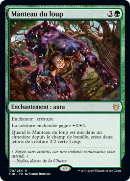 | Rules | Enchant creature Enchanted creature gets +4/+4. When Mantle of the Wolf is put into a graveyard from the battlefield, create two 2/2 green Wolf creature tokens. |