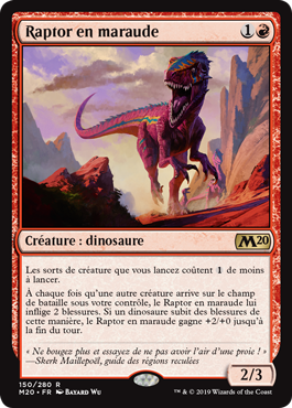 | Rules | Creature spells you cast cost less to cast. Whenever another creature enters the battlefield under your control, Marauding Raptor deals 2 damage to it. If a Dinosaur is dealt damage this way, Marauding Raptor gets +2/+0 until end of turn. |