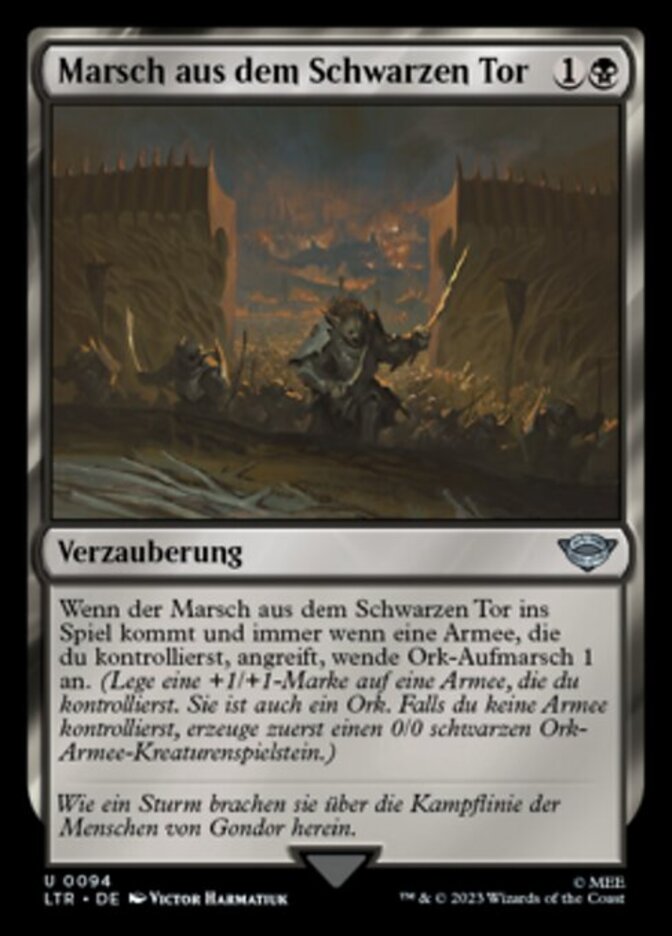 | Rules | When March from the Black Gate enters the battlefield and whenever an Army you control attacks, amass Orcs 1. (Put a +1/+1 counter on an Army you control. It's also an Orc. If you don't control an Army, create a 0/0 black Orc Army creature token first.) |