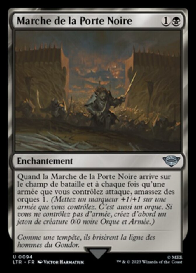 | Rules | When March from the Black Gate enters the battlefield and whenever an Army you control attacks, amass Orcs 1. (Put a +1/+1 counter on an Army you control. It's also an Orc. If you don't control an Army, create a 0/0 black Orc Army creature token first.) |