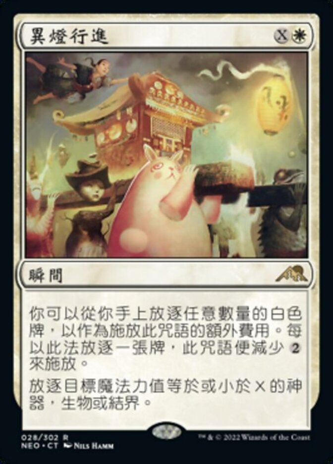 | Rules | As an additional cost to cast this spell, you may exile any number of white cards from your hand. This spell costs less to cast for each card exiled this way. Exile target artifact, creature, or enchantment with mana value X or less. |