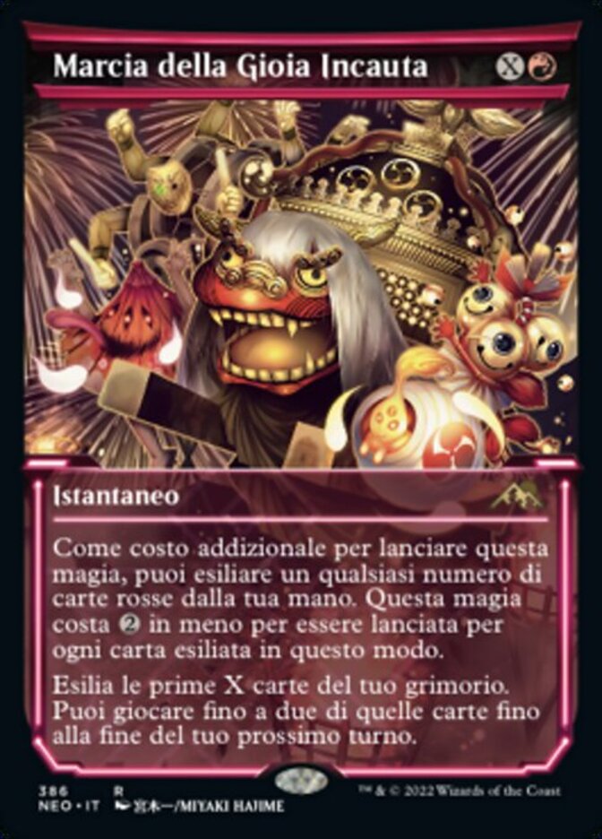 | Rules | As an additional cost to cast this spell, you may exile any number of red cards from your hand. This spell costs less to cast for each card exiled this way. Exile the top X cards of your library. You may play up to two of those cards until the end of your next turn. |