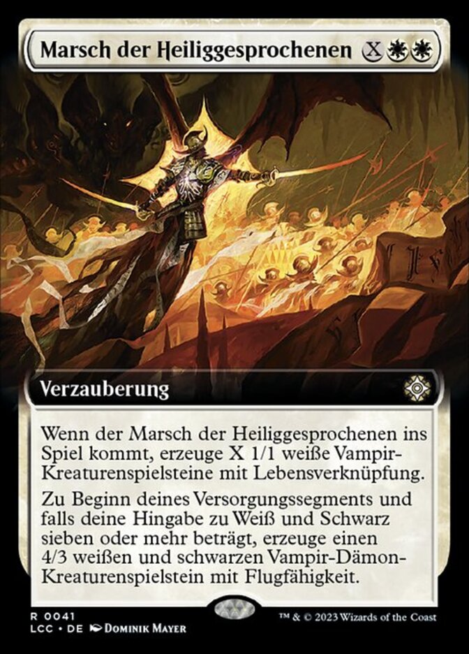 | Rules | When March of the Canonized enters the battlefield, create X 1/1 white Vampire creature tokens with lifelink. At the beginning of your upkeep, if your devotion to white and black is seven or greater, create a 4/3 white and black Vampire Demon creature token with flying. |