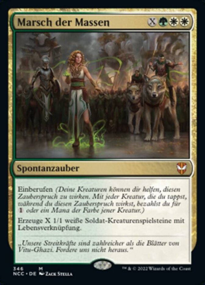 | Rules | Convoke (Your creatures can help cast this spell. Each creature you tap while casting this spell pays for or one mana of that creature's color.) Create X 1/1 white Soldier creature tokens with lifelink. |