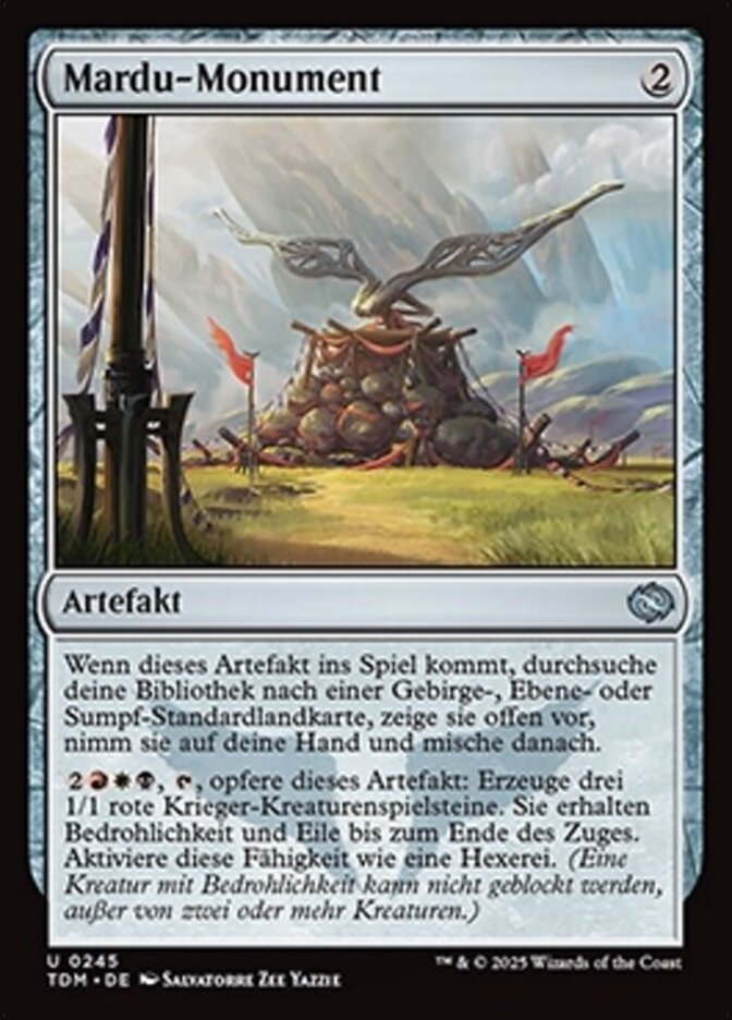| Rules | When this artifact enters, search your library for a basic Mountain, Plains, or Swamp card, reveal it, put it into your hand, then shuffle. , , Sacrifice this artifact: Create three 1/1 red Warrior creature tokens. They gain menace and haste until end of turn. Activate only as a sorcery. (A creature with menace can't be blocked except by two or more creatures.) |