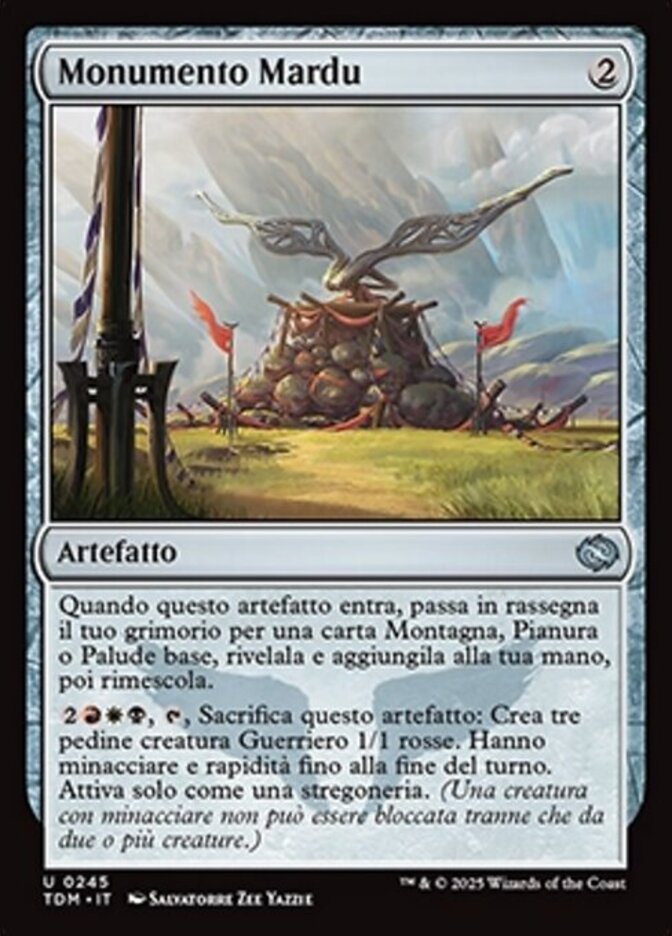 | Rules | When this artifact enters, search your library for a basic Mountain, Plains, or Swamp card, reveal it, put it into your hand, then shuffle. , , Sacrifice this artifact: Create three 1/1 red Warrior creature tokens. They gain menace and haste until end of turn. Activate only as a sorcery. (A creature with menace can't be blocked except by two or more creatures.) |